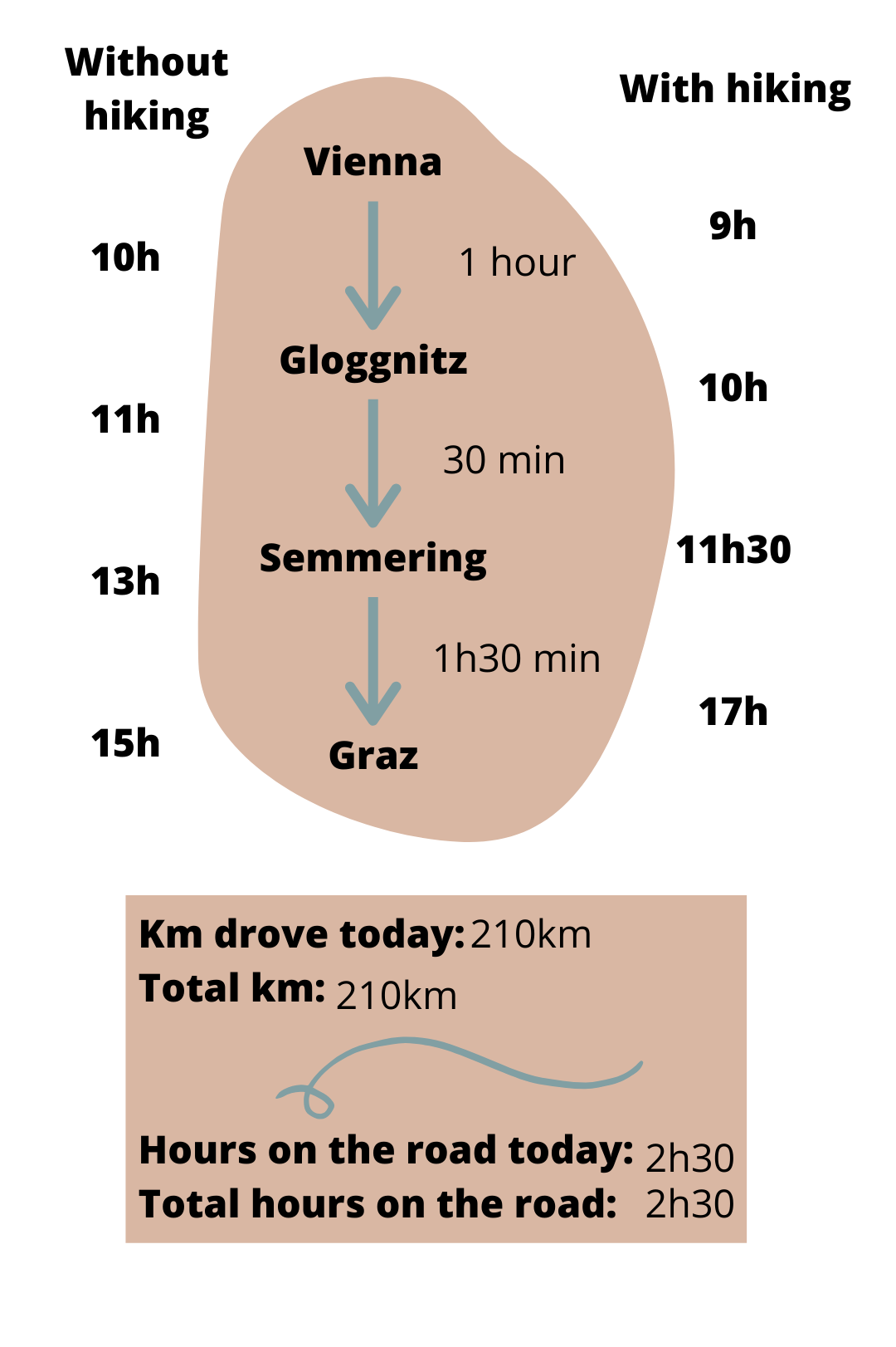 On the first day of this trip, we will get to Graz. From Vienna to Graz are only 2h by car through the quickest road. However, going through lesser-known villages can be way more interesting. As a result, from Vienna, we go to Graz through Gloggnitz and Semmering.