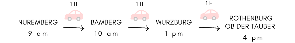 From Nuremberg you can get to Rothenburg ob der Tauber in aroud 1 hour and 30 minutes. However, you can take the longer route and enjoy a couple of hours in Bamberg and Würzburg, which are beautiful cities that really deserve a stop.