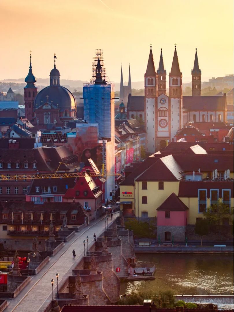 In Würzburg, one of the most famous landmarks is the Würzburg Residence, a baroque palace from the 18th century that in 1981 has been a UNESCO World Heritage Site. Besides this palace, you can also find other amazing buildings in the town such as the Falkenhaus, with its bright yellow rococo façade or the Festung Marienberg with its beautiful panoramic views of the city and its slopes with vineyards.