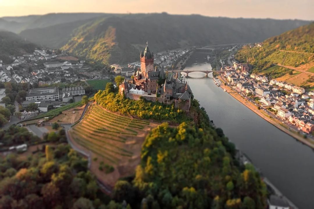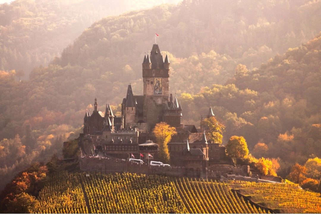 Cochem is a riverside town in the Moselle river. This town has beautiful scenery to vineyards and the river. It is famous for the Reichsburg Cochem, on a hill on top of the town. The hill is covered by a vineyard which makes the landscape beautiful.